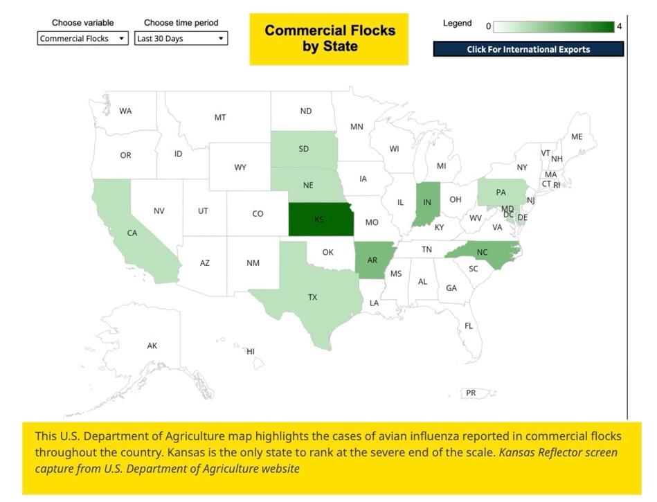 Kansas is suffering from the worst outbreak of highly pathogenic avian influenza in the country, with nearly 414,000 birds affected, according to the U.S. Department of Agriculture. HPAI, an umbrella term for avian influenza that includes highly contagious strains such as H5 and H7, is considered a low public health risk, although it can pass to humans through birds and dairy products from infected cattle, according to the U.S. Centers for Disease Control and Prevention.