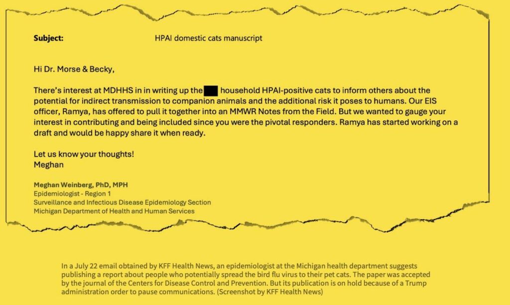 It is difficult to comprehend, but the administration’s decision to cut off the flow of critical information cannot help but make us less prepared to deal with the pandemics that might be headed our way. KFF points to one of those casualties, an important report from the Michigan Department of Health and Human Services: