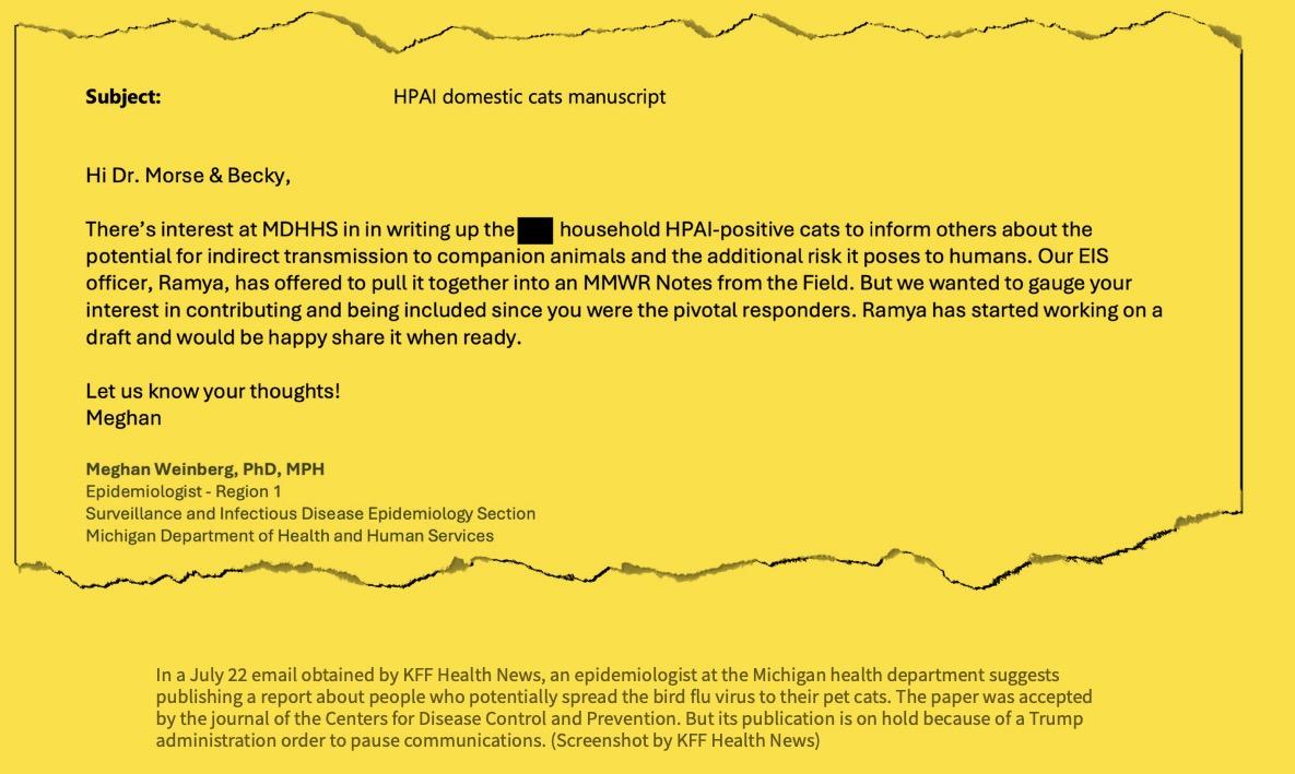 The Trump administration has intervened in the release of important studies on the bird flu, as an outbreak escalates across the United States. One of the studies would reveal whether veterinarians who treat cattle have been unknowingly infected by the bird flu virus. Another report documents cases in which people carrying the virus might have infected their pet cats.