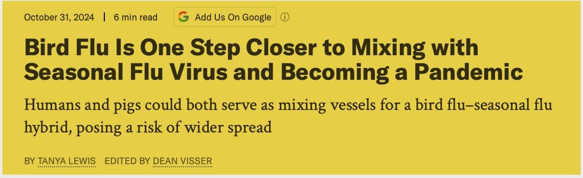As for versatility of viruses, Tanya Lewis has previously reported for Scientific American the possibility that bird flu might adapt and mix with seasonal influenza to pose a greater risk to humans: