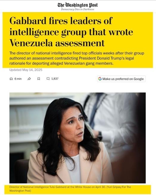 Director of National Intelligence Tulsi Gabbard has fired the top two officials at the National Intelligence Council, weeks after the council wrote an assessment that contradicted President Donald Trump’s rationale for invoking the Alien Enemies Act and deporting alleged Venezuelan gang members without due process. Gabbard removed Michael Collins, the acting chair of the National Intelligence Council, as well as his deputy, Maria Langan-Riekhof, according to a spokesperson for Gabbard’s office.