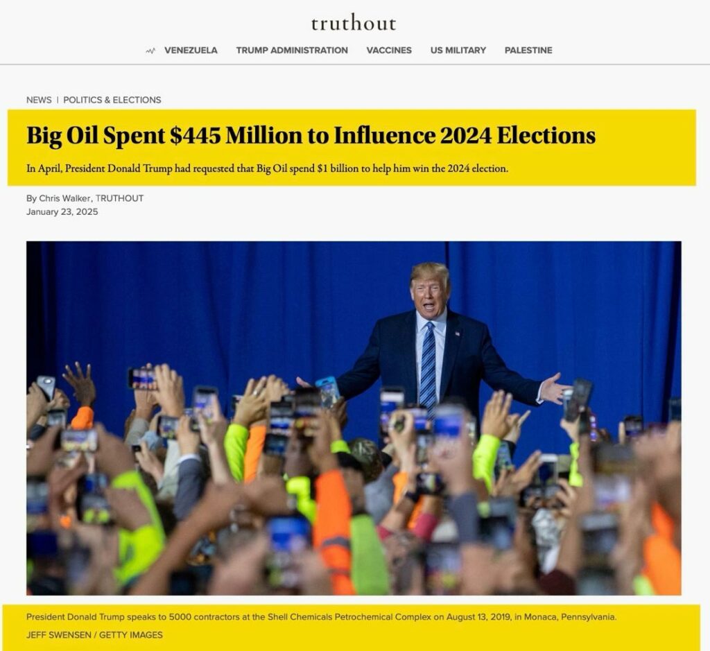 A new report details how fossil fuel executives helped finance President Donald Trump’s 2024 election win, spending millions of dollars to influence the race in his favor. The report from Climate Power, a progressive group dedicated to ‘winning the politics of climate,’ suggests that Big Oil’s donations to Trump — coupled with hundreds of millions of dollars spent on lobbying Congress over the past year — will majorly increase profits for the industry. ‘Big Oil’s total financial influence this election cycle amounts to an astounding $445 million, the report states, noting that the oil and gas industries also donated to dark money groups in support of Republicans and Trump that make it ‘nearly impossible to understand the full scope of their impact’ over the past year.