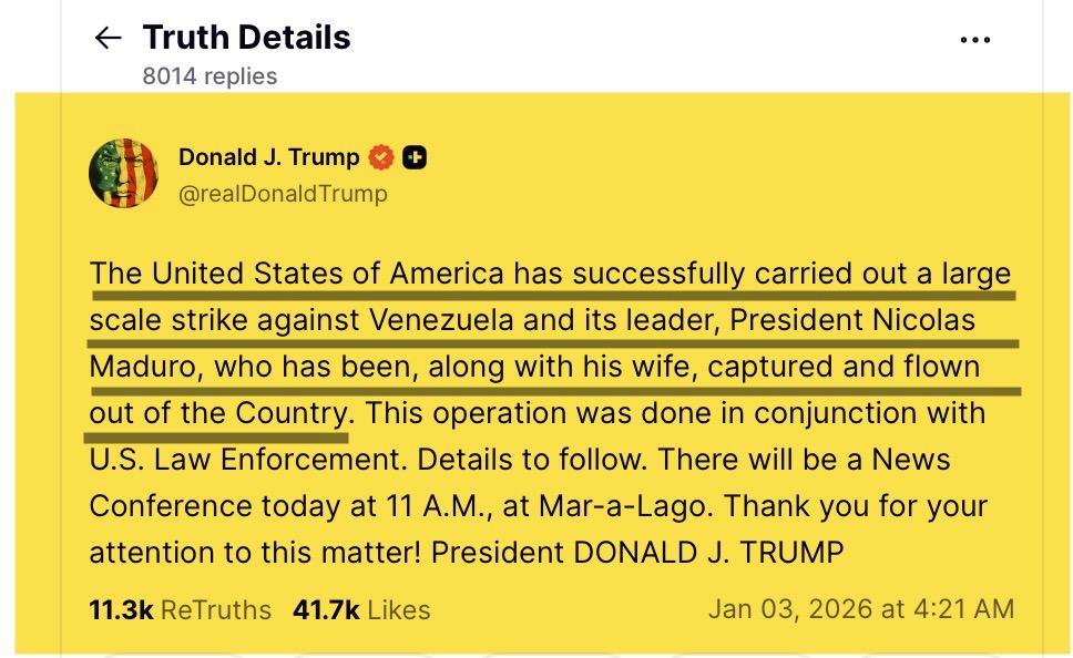Now, usually, when an outsider—especially one who does not speak the language and has never lived there and who does not particularly like the people who do live there—begins to run your country, it is because he has invaded and won a war, not just executed an arrest warrant. So, I am guessing, when told that the gringo MAGA president of the United States says he is going to run their country, many Venezuelans might regard this as a pretty serious declaration of war.