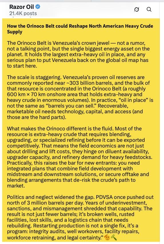 When people say ‘Venezuela has the world’s largest oil reserves,’ as you undoubtedly have seen being thrown around a lot on here, they are technically referring to a specific accounting definition, not to a stock of easy, cheap barrels ready to flood the market. To unpack that, you need to get into what those reserves are, how they behave in the subsurface, what it costs to turn them into marketable liquids, and how price, technology, and above-ground risk interact. That’s a lot to cover, but let’s give it my best shot. On paper, Venezuela has roughly 300–303 billion barrels of proved reserves, about 17 % of the global total and slightly more than Saudi Arabia. The critical detail is that around three quarters of that booked volume is extra-heavy crude from the Orinoco Belt in eastern Venezuela … the technically accurate part is that the country has extremely large volumes of extra-heavy oil in place, and a big subset of that was once judged economically recoverable at high price assumptions and booked as proved. The more relevant questions for energy strategy are how many of those barrels are genuinely economic under realistic long-term prices, how quickly they can be brought onstream given infrastructure and institutional constraints, what netback they deliver at the refinery gate, and how exposed they are to being left in the ground if demand peaks. On those metrics, Venezuelan barrels sit much further out on the cost and risk curve than the headline ‘largest reserves’ soundbite suggests.