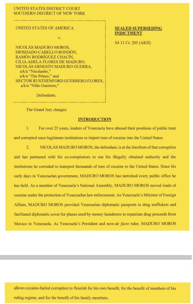 [M]assive-scale drug trafficking has also concentrated power and wealth in the hands of MADURO MOROS’s family, including his wife, the purported First Lady of Venezuela CILIA ADELA FLORES DE MADURO, the defendant, and MADURO MOROS’s son, member of Venezuela’s National Assembly NICOLAS ERNESTO MADURO GUERRA, a/k/a ‘Nicolasito,’ a/k/a ‘The Prince,’ the defendant. This cycle of narcotics-based corruption lines the pockets of Venezuelan officials and their families while also benefiting violent narco-terrorists who operate with impunity on Venezuelan soil and who help produce, protect, and transport tons of cocaine to the United States.