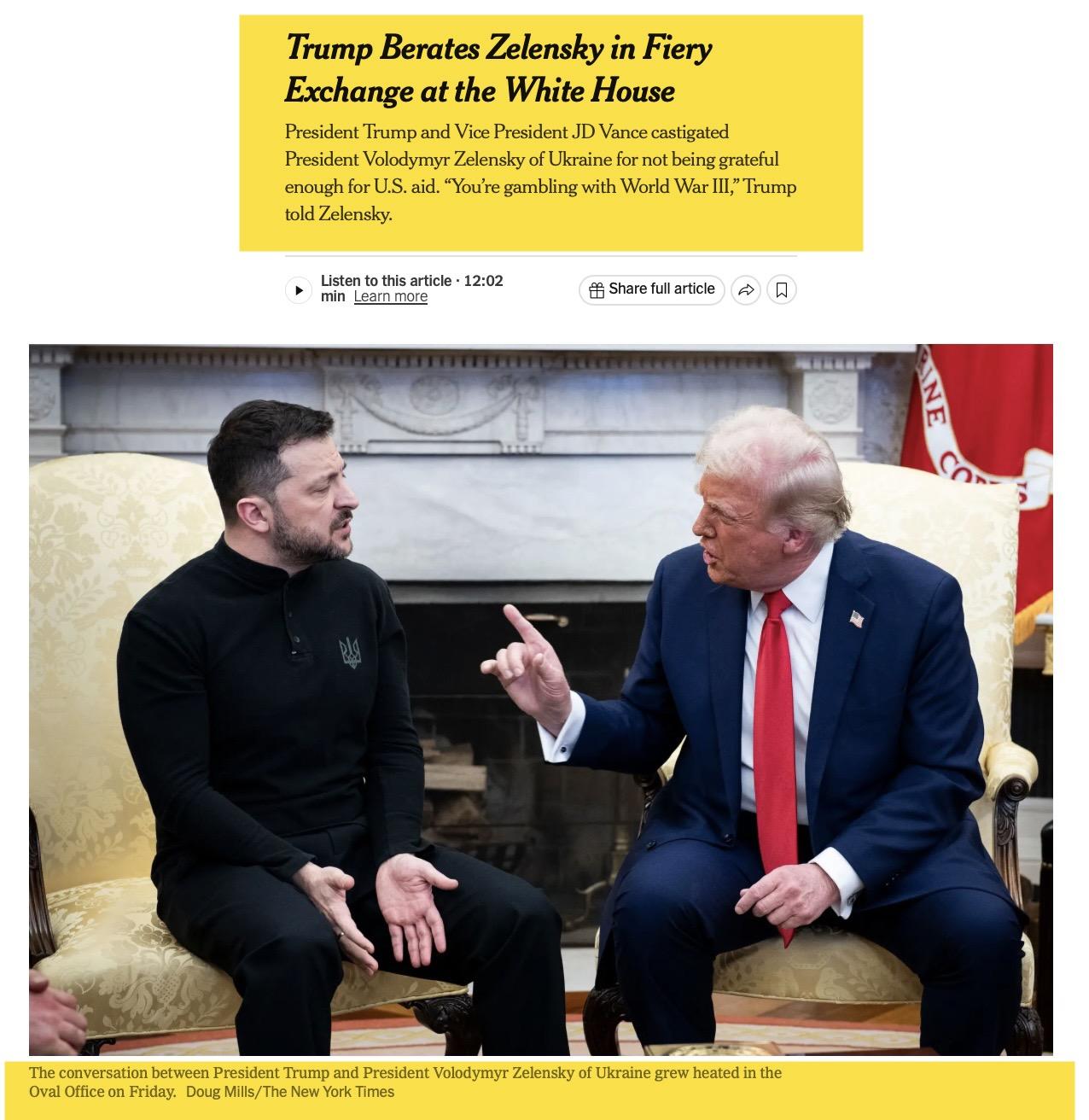 President Trump and Vice President JD Vance castigated President Volodymyr Zelensky of Ukraine for not being grateful enough for U.S. aid. ‘You’re gambling with World War III,’ Trump told Zelensky … In a fiery public confrontation unlike any seen between an American president and foreign leader in modern times, Mr. Trump and Mr. Vance … sought to strong-arm him into making a peace deal on whatever terms the Americans dictated.