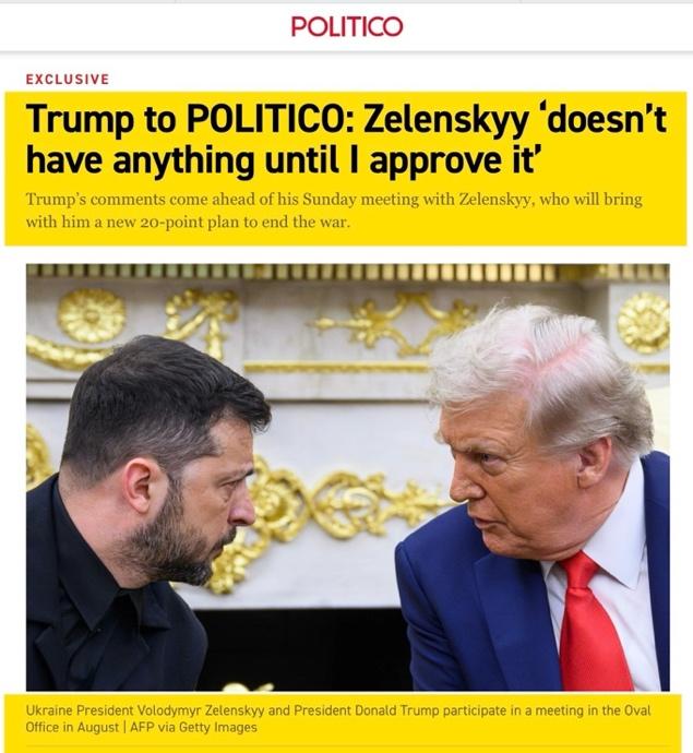 President Donald Trump on Friday cast himself as the ultimate arbiter of any peace deal between Ukraine and Russia, in an exclusive conversation with POLITICO. Ukrainian President Volodymyr Zelenskyy is expected to meet with Trump in Florida on Sunday and told reporters he’s bringing with him a new 20-point plan for peace. The framework includes a proposed demilitarized zone and the meeting is expected to focus on U.S. security guarantees.