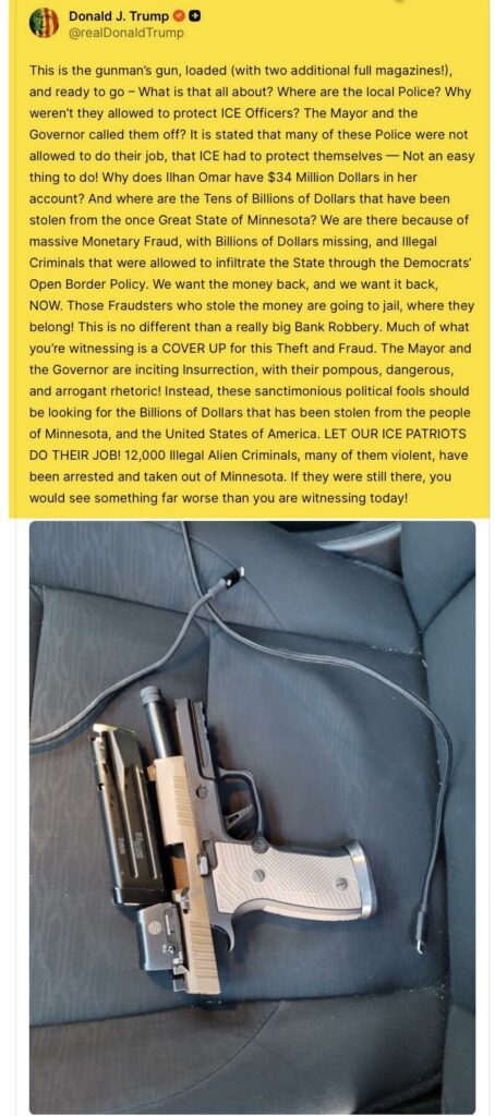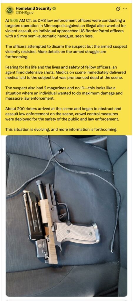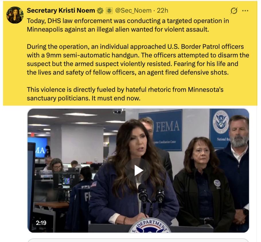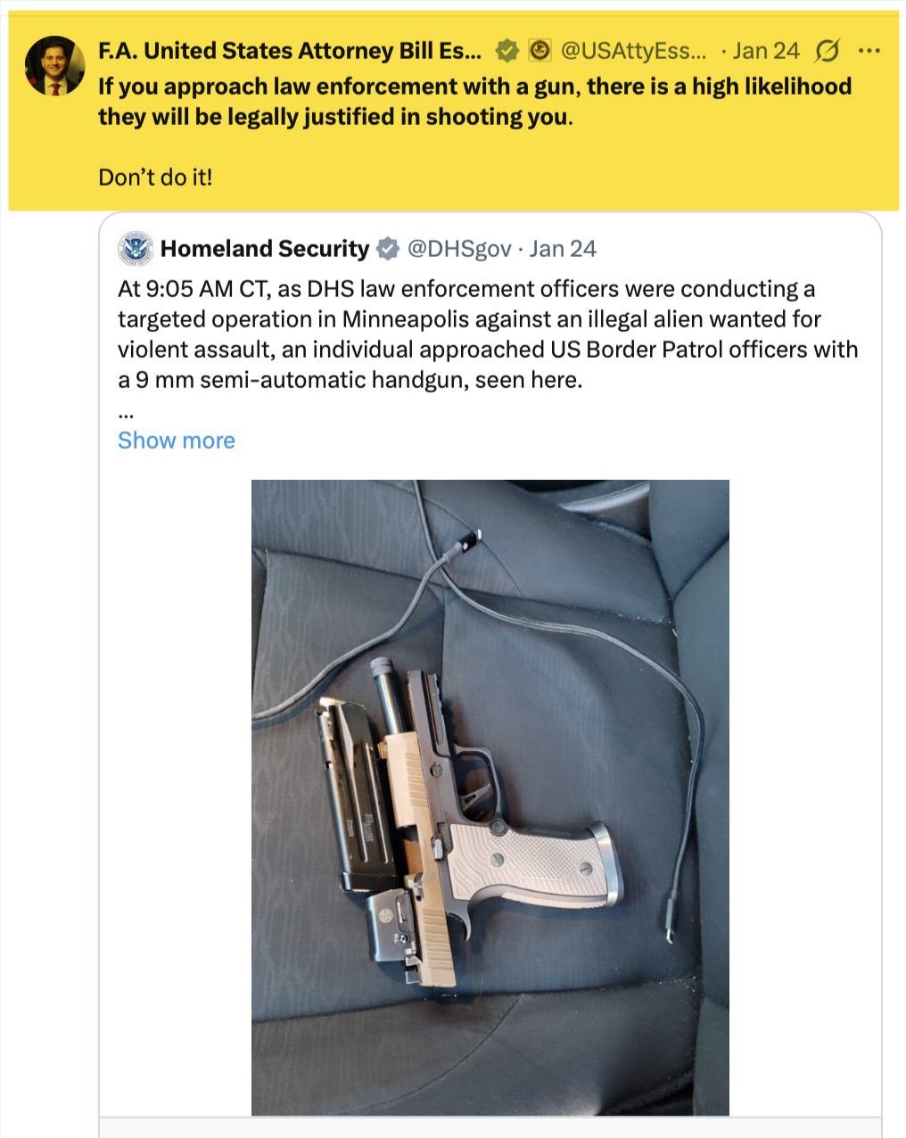So, yes, a picture of a gun on a car seat, without an evidence bag and with a dubious chain of custody, is now their excuse to declare guilt. But all it takes are the cellphone videos and the statements of eyewitnesses to know this DHS statement is an utter lie. I wonder if Kristi Noem knows how unconvincing she is? Does she even care?