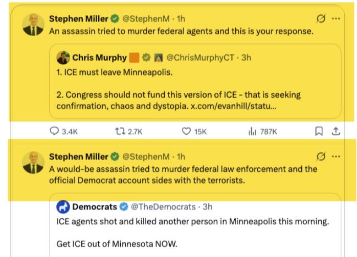 Stephen Miller, of course, does not have a care in the world, having long ago sold his soul for his place at the White House and the privilege of whispering into Donald Trump’s ear. Miller, the architect of our largest purge of immigrants with or without papers, has set the stage for the killings. He has repeatedly denigrated local law enforcement while claiming the supremacy of ICE and the Border Patrol, no matter how ill equipped and untrained they are for interacting with an active and concerned community. Blameless as long as they are willing and able to act as Donald Trump’s domestic army: