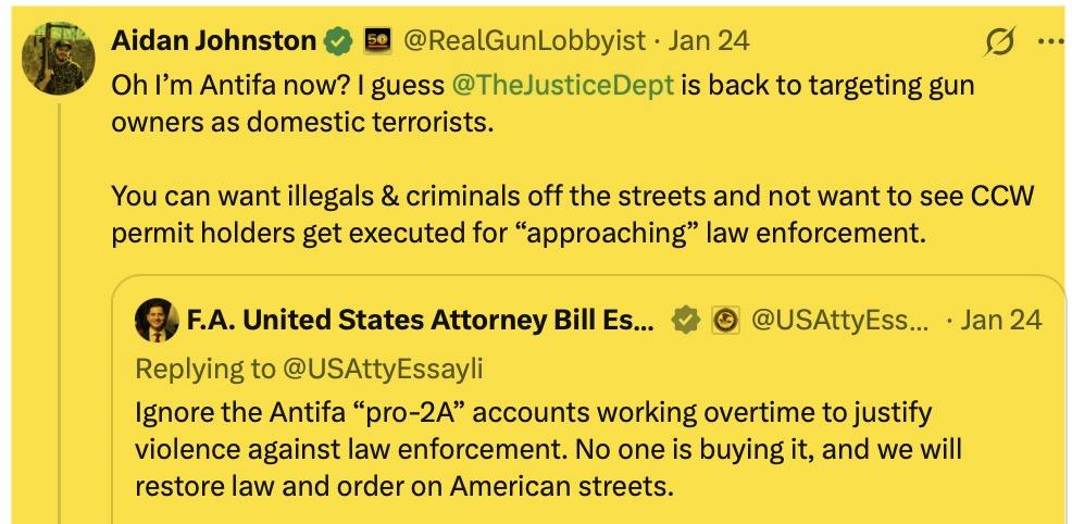 Aidan Johnston, the director of federal affairs for Gun Owners of America, posted this sarcastic response to Essayli on X: “This fancy government attorney writes a bad tweet and all of a sudden gun owners are domestic terrorists. That just PERFECTLY encapsulates what’s wrong with the federal government.” Then this exchange: