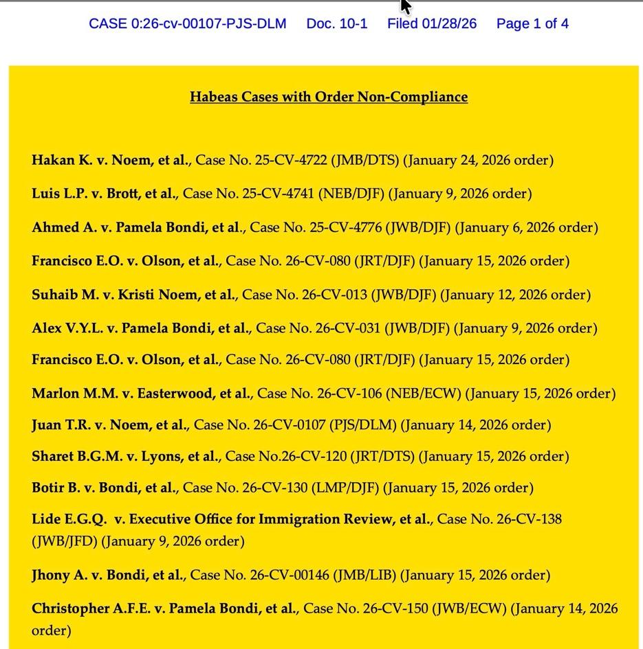 Minnesota Chief Federal Judge Patrick J. Schiltz included a list of nearly 100 instances where the federal government and DHS have ignored court orders to provide habeas corpus hearings for arrested migrants. Here is just a portion of that list: