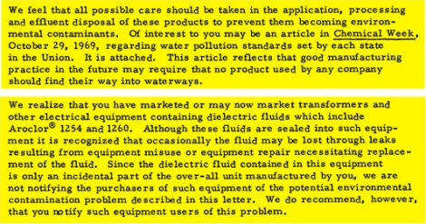 It is claimed that the PCBs found strongly resemble chlorinated biphenyls containing 54 [percent] and 60 [percent] chlorine by weight. Products which are sold by Monsanto under the trade names of Aroclor® 1254 and 1260 do contain chlorinated biphenyls … As your supplier of Aroclor® 1254 and 1260 and formulated products containing 1254, we wish to alert you to the potential problem of environmental contamination as referred to in the newspaper and magazine articles …