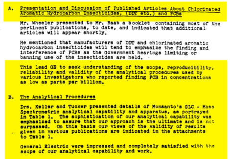 If these notes are accurate, and if GE was completely satisfied, it appears that Monsanto never fully shared with GE its knowledge of—and GE never fully appreciated—the reliability of several studies showing why its Aroclor (Pyranol) needed to be kept from leaving their factories, or the details of what actually happened with the PCBs that made it to the environment.