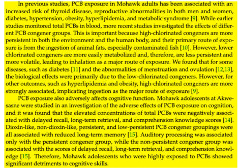Dr. Carpenter has demonstrated how exposure to PCBs has affected members of the Mohawk Akwesasne Nation in New York State: