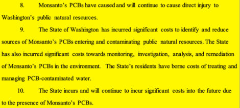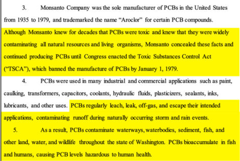 As for other successful legal actions against Monsanto, the state of Washington filed a complaint in 2016 alleging that there was a long list “of water bodies within the state of Washington that are contaminated with Monsanto’s PCBs, as measured in fish tissue or sediment PCBs in the environment.”