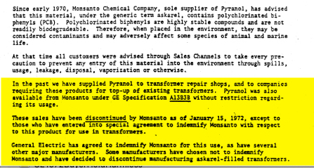 These sales have been discontinued by Monsanto as of January 15, 1972, except to those who have entered into special agreement to indemnify Monsanto with respect to this product in transformers … General Electric has agreed to indemnify Monsanto for this use …