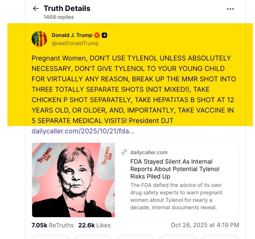 As for their latest Tylenol nonsense, Nishad Okutoyi, writing for the October 30, 2025 issue of Johns Hopkins Newsletter, stated: