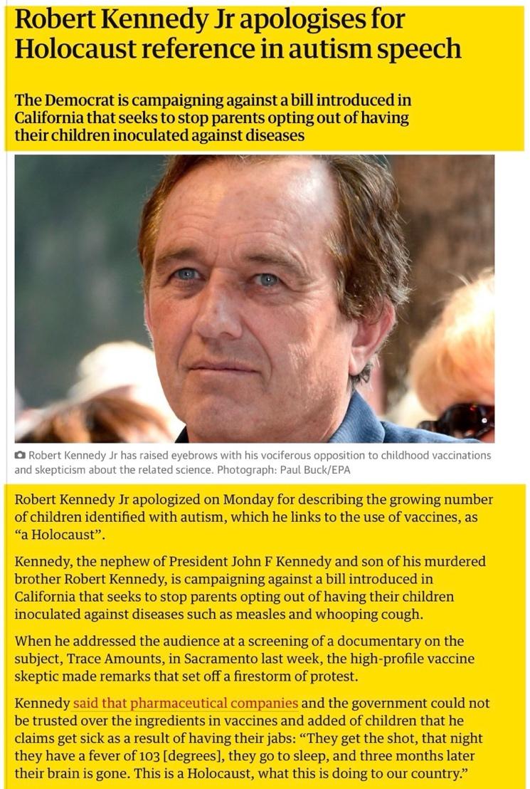 Kennedy’s language was indeed outrageous: “They get the shot, that night they have a fever of 103 [degrees], they go to sleep, and three months later their brain is gone. This is a Holocaust, what this is doing to our country.” For Kennedy, doctors were killers not healers, and autistic children had no brains.