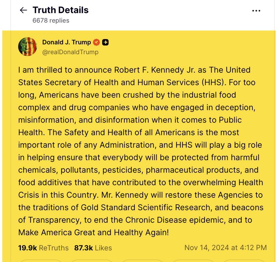 So, having learned nothing from COVID, Donald Trump decided to appoint vaccine skeptic Robert F. Kennedy Jr. to head the Department of Health and Human Services, promising Kennedy would make America Great and Healthy Again: