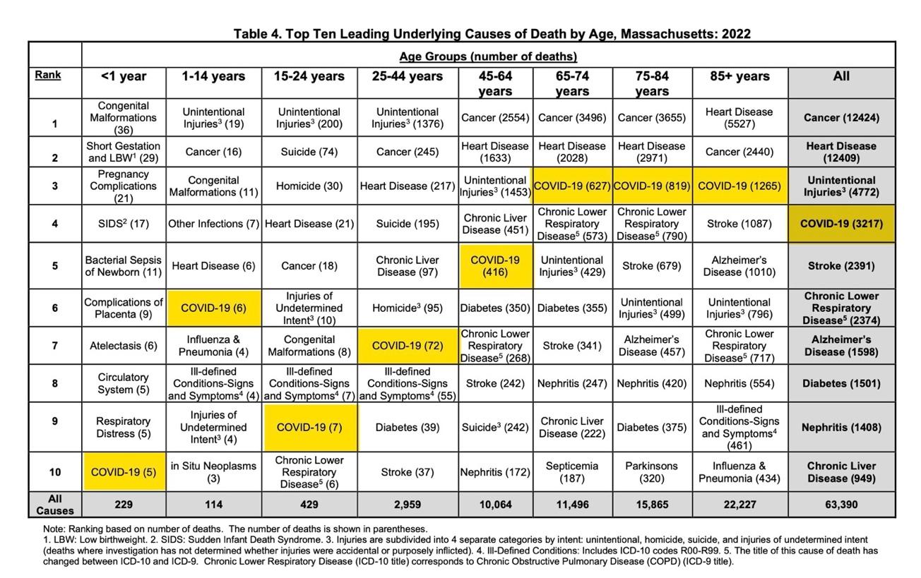 The frightening reality is that far too many people suffered and needlessly died because both Donald John Trump and Robert F. Kennedy Jr. continued to lie about COVID-19. Unfortunately, whether we understand it or not, the stakes for all of us have been—and are still—so very high. Many of us have successfully put thoughts of COVID-19 behind us, and sadly, completely reliable statistics of the toll COVID has taken are still lacking. I doubt we will ever have an accurate picture of how many were stricken, how many still suffer from long COVID, and how many died. But here are the latest statistics for deaths in Massachusetts for 2022. For us in Massachusetts, COVID-19 was the fourth highest cause of death: