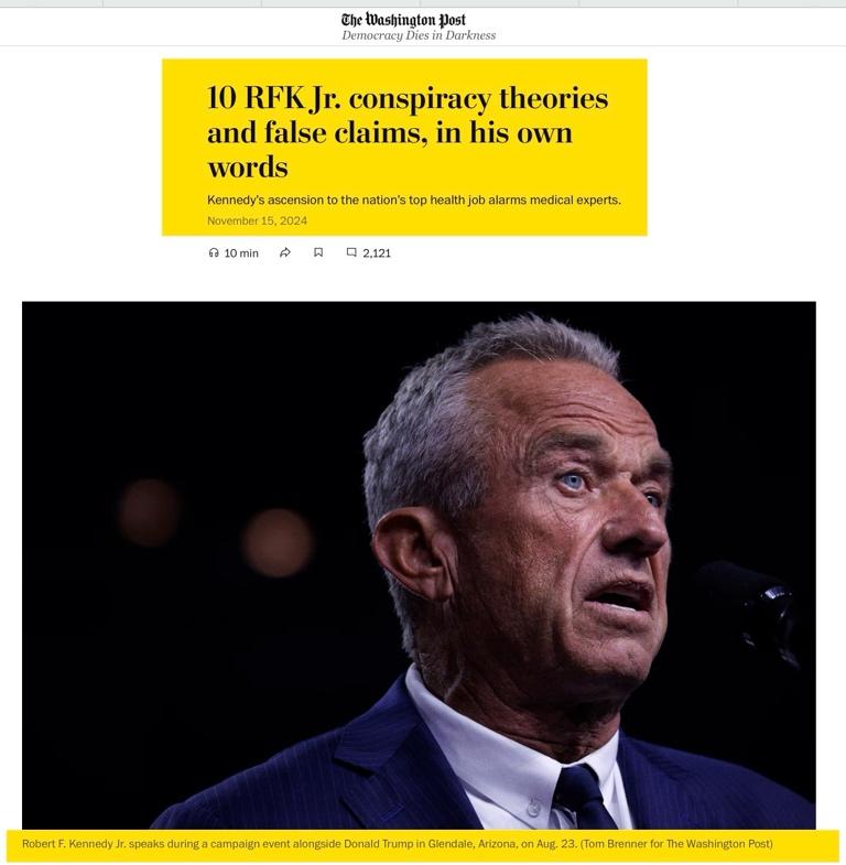 So just how sensible and reliable has Robert F. Kennedy’s medical advice been in the past? The Washington Post collected a bunch of his misleading statements.