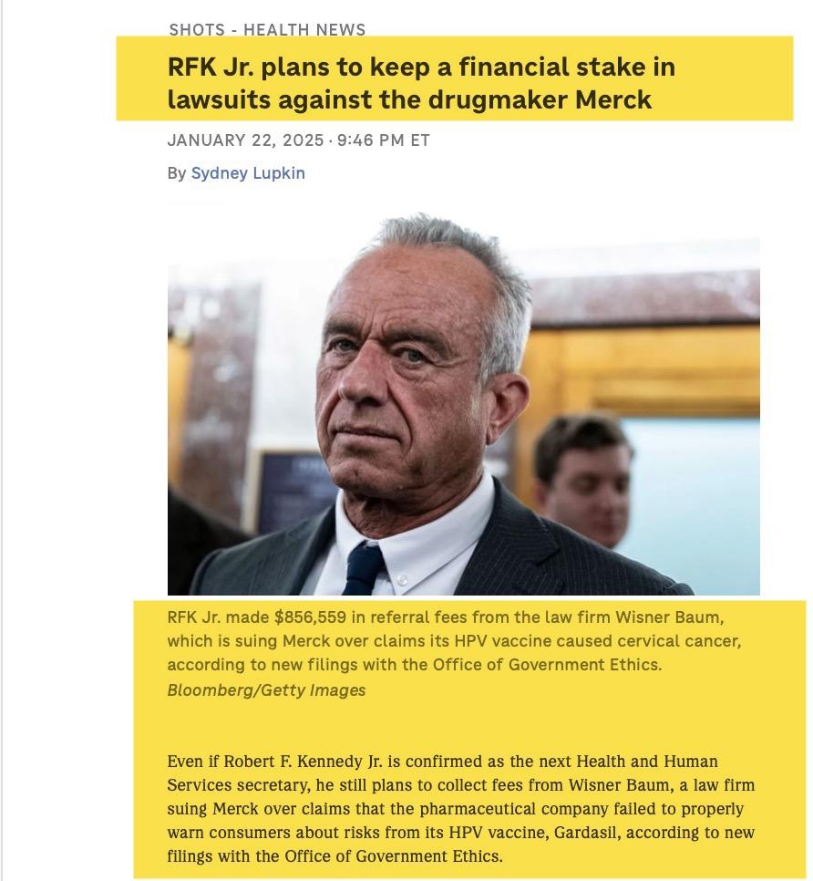 ‘RFK Jr’s ethics agreement is inadequate because it doesn’t address the bias created by his continuing financial interest in the litigation against Merck,’ Kathleen Clark, a law professor at Washington University in St. Louis who specializes in government ethics wrote to NPR …