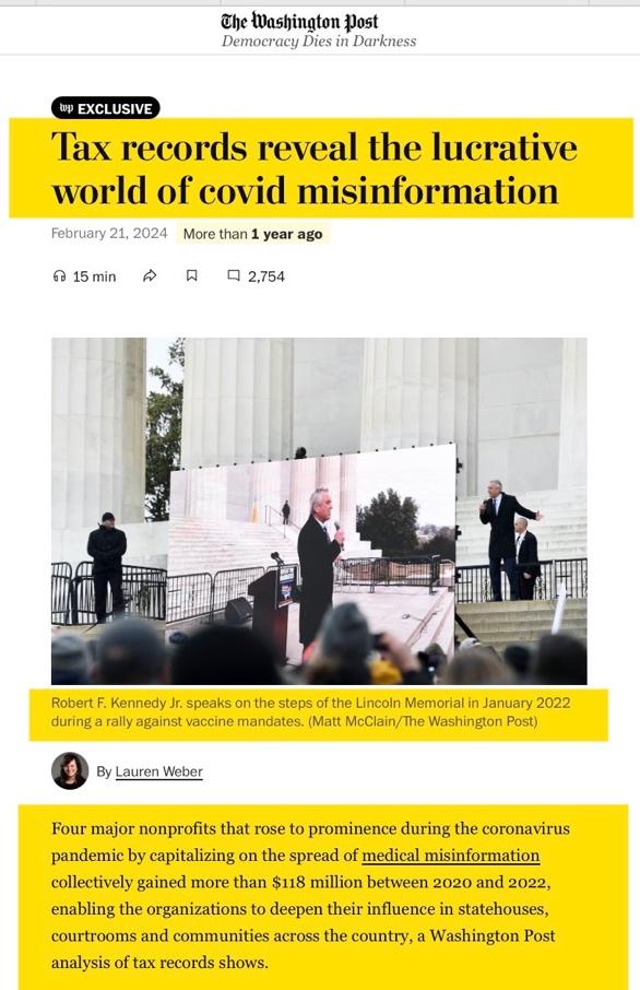 Ironically, a sizeable portion of Americans have come to regard Robert F. Kennedy Jr. as a champion doing battle against the trifecta of rapacious Big Pharma, the medical researchers slavishly dependent on Pharma funding, and the hapless bureaucrats at our regulatory agencies who capitulate to them. Yes, there is no denying that greed is ever-present in the healthcare economy—from Medicare and Medicaid fraud to fabulously excessive executive salaries, or the failures in Washington to prosecute that thievery, but as The Washington Post pointed out on February 21, 2024, there is too much money to be made exploiting the suffering and helplessness of families who are sick and desperate for cures: