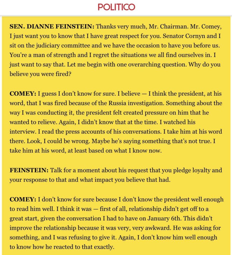 During Comey’s testimony before the Senate Intelligence Committee, Senator Diane Feinstein asked him why he thought he had been fired: