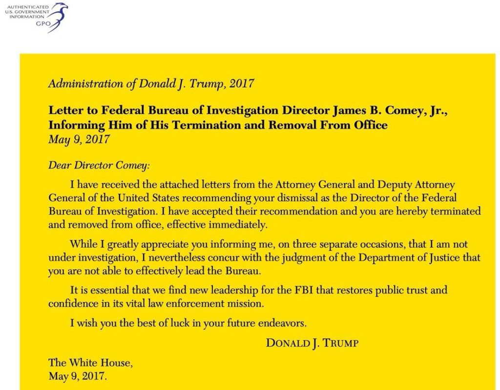My amazing assistant, Althea James, got the letter from the White House guy at the front door down on Pennsylvania Avenue [see here]. … I was fired, effective immediately, by the president who had repeatedly praised me and asked me to stay, based on a recommendation from the deputy attorney general, who had praised me as a great leader, a recommendation accepted by the attorney general, who was both recused from all Russia-related matters and who, according to President Trump at our dinner, thought I was great. The reasons for that firing were lies, but the letter was real. I felt sick to my stomach and slightly dazed …