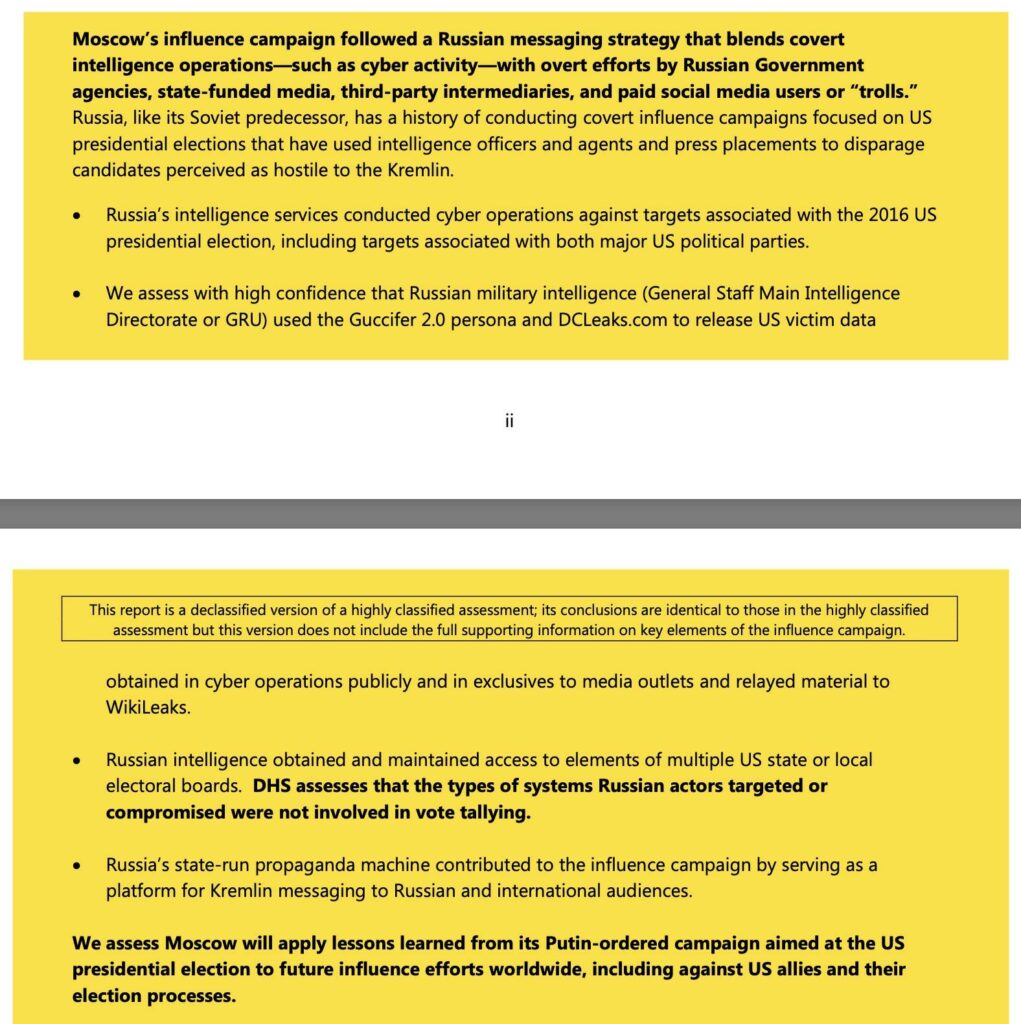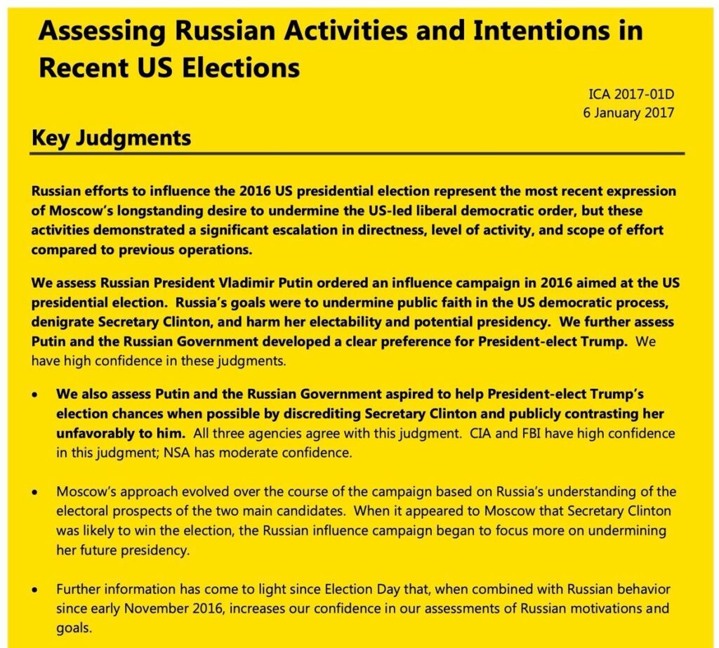 Unfortunately for Comey, they had also been given the Steele Dossier. Remember, the ICA made it clear that after considerable analysis, the intelligence community believed there was no question that the Russians had intervened in a variety of ways in our presidential election: