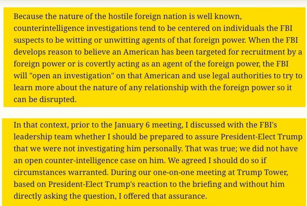 I explained that I wasn’t saying the FBI believed the allegations. We simply thought it important that he know they were out there and being widely circulated … it was important that he know Russians might be saying such things. I stressed that we did not want to keep information from him, particularly given that the press was about to report it. He again strongly denied the allegations, asking—rhetorically, I assumed—whether he seemed like a guy who needed the services of prostitutes … He then began discussing cases where women had accused him of sexual assault, a subject I had not raised. He mentioned a number of women, and seemed to have memorized their allegations. As he began to grow more defensive and the conversation teetered toward disaster, on instinct, I pulled the tool from my bag: ‘We are not investigating you, sir.’ That seemed to quiet him. My job done, the conversation ended, we shook hands and I left the conference room …