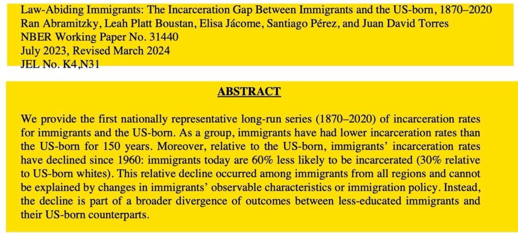 But Stephen Miller and Donald Trump are lying. A study titled “Law Abiding Immigrants: The Incarceration Gap Between Immigrants and the U.S. Born, 1870 – 2020” recently revised by the National Bureau of Economic Research in 2024 found the following: