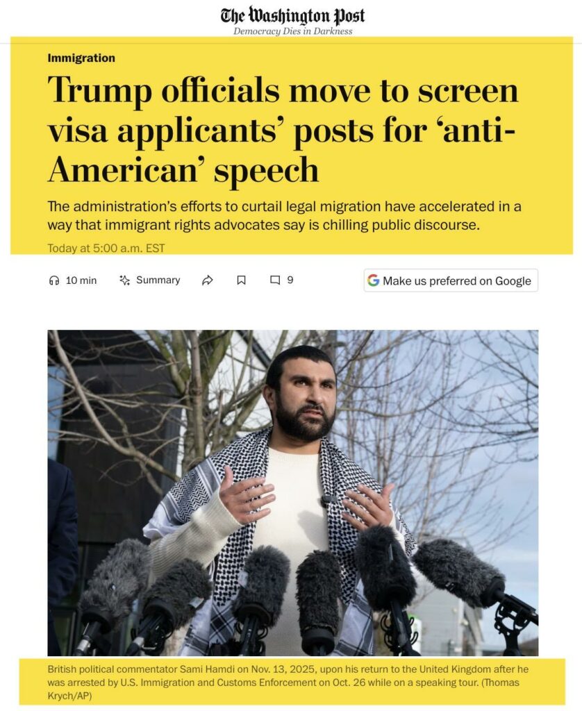 The administration’s efforts to curtail legal migration have accelerated in a way that immigrant rights advocates say is chilling public discourse … The Trump administration is widening efforts to screen visa applicants for online speech considered dangerous and ‘anti-American’ as the government moves to restrict legal migration and remove people from places the president has called ‘garbage.’