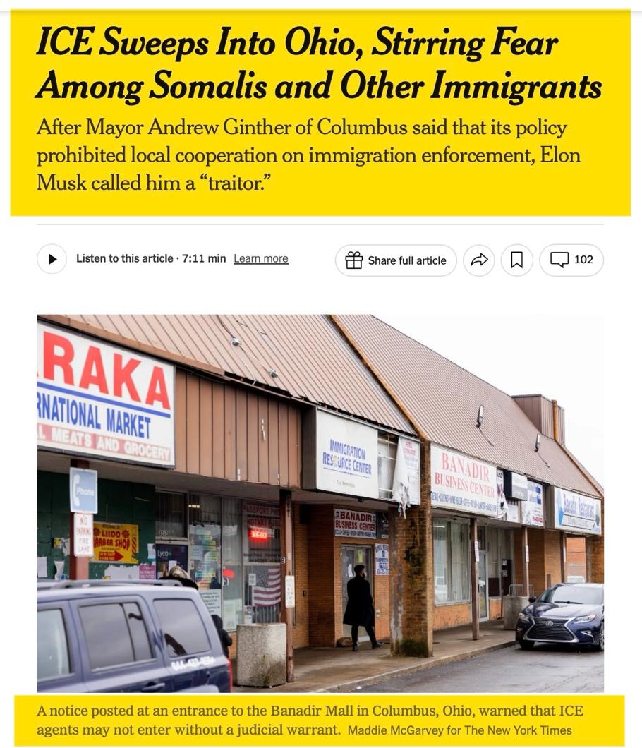 After Mayor Andrew Ginther of Columbus said that its policy prohibited local cooperation on immigration enforcement, Elon Musk called him a ‘traitor’ … Naturalized citizens in Ohio’s capital, Columbus, have taken to carrying passports with them. Businesses and nonprofits that serve immigrants around the city are delivering goods to customers who are afraid to venture outside their homes. Churches in immigrant neighborhoods are all but empty.