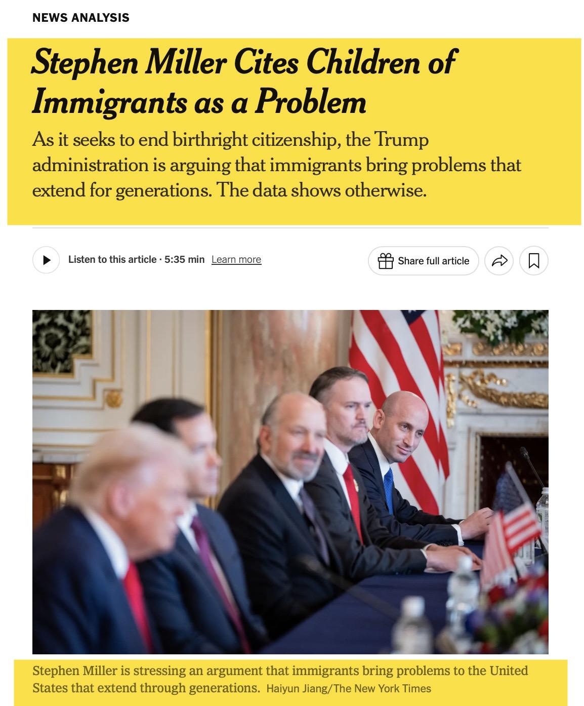 As it seeks to end birthright citizenship, the Trump administration is arguing that immigrants bring problems that extend for generations. The data shows otherwise … When Stephen Miller, one of President Trump’s top advisers, makes the case for the Trump administration’s crackdown on immigration, he is focused not only on the actions of those who came to the United States from another country. Increasingly, he blames their children as well.