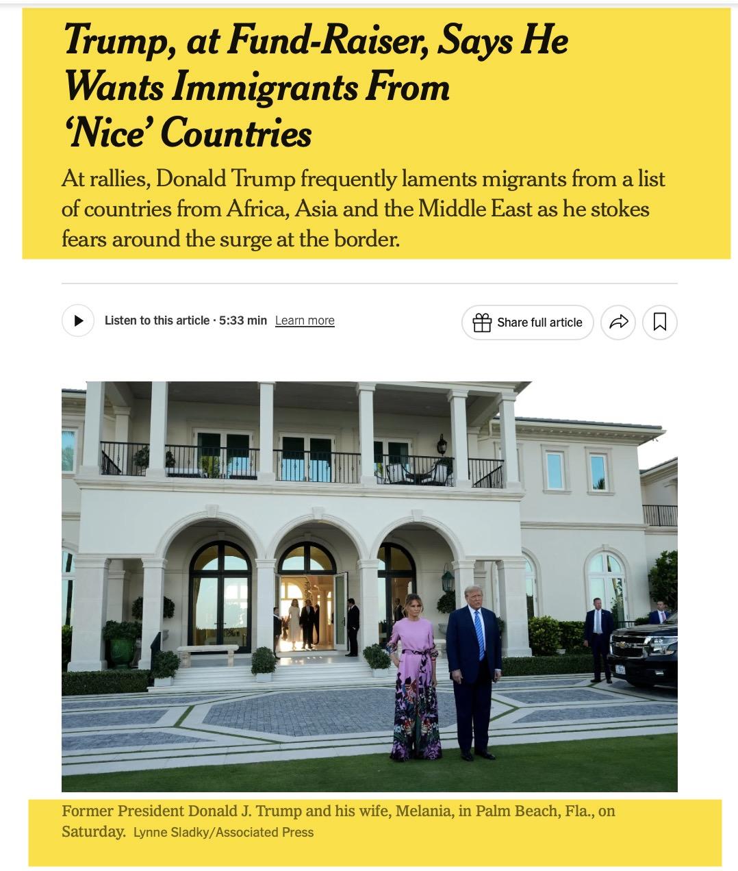 At rallies, Donald Trump frequently laments migrants from a list of countries from Africa, Asia and the Middle East as he stokes fears around the surge at the border … Former President Donald J. Trump, speaking at a multimillion-dollar fund-raiser on Saturday night, lamented that people were not immigrating to the United States from ‘nice’ countries ‘like Denmark’ and suggested that his well-heeled dinner companions were temporarily safe from undocumented immigrants nearby, according to an attendee.