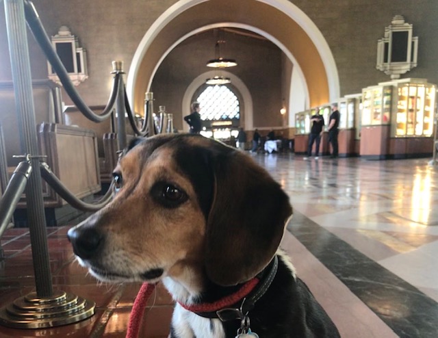 As we traversed the city, we found respite from the heat in various ways. Fred and I revived ourselves in Union Station, where the cool floors provided respite for Fred from the heat outside. From there, we judiciously crossed to the shady side of the streets as we headed down the cement sidewalks of Chinatown, and then stepped into Phillipe’s for Fred’s first French dip (a favorite food of mine from a favorite haunt dating from my days living in LaLa Land), and then headed off in search of the Disney Center, its stainless steel glow in the distance leading us forward.