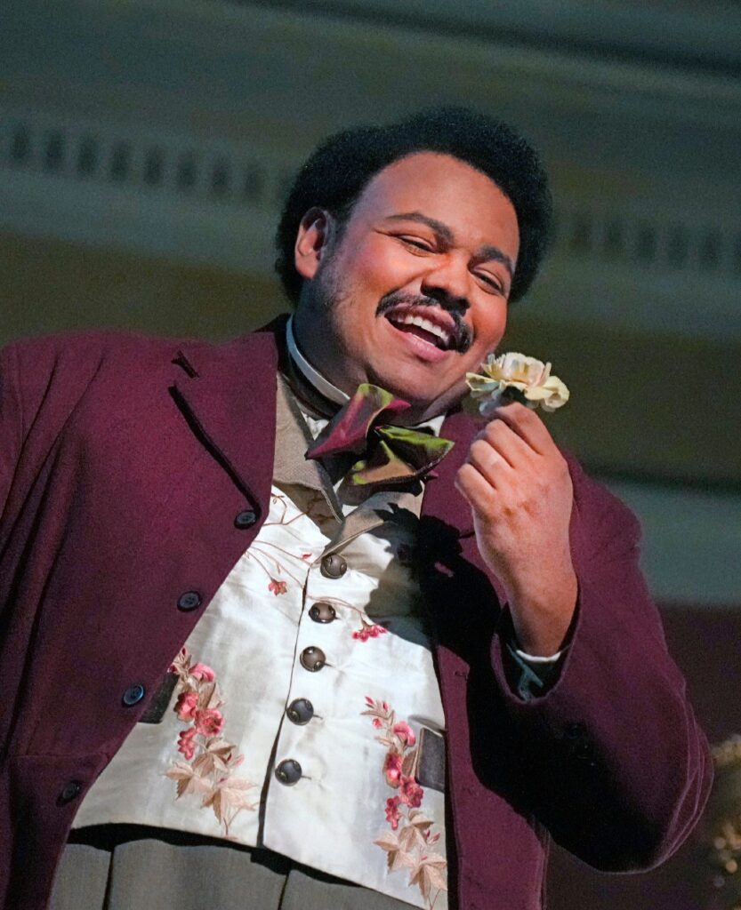 On the other hand, Joshua Blue as her lover, Alfredo Germont, was magnificent. His strong tenor voice was occasionally overwhelming, particularly when director Jonathan Loy placed him in a stage box instead of behind the set at the end of Act One. Alfredo is a role with great human foibles, and Blue made us feel them as his affair with his lover, Violetta, progressed. Once again, Loy denied us one of the opera’s most alarming moments when Alfredo humiliates his lady by tossing his winnings in her face (ordinarily) at a party, marking her as a paid courtesan for all to see.