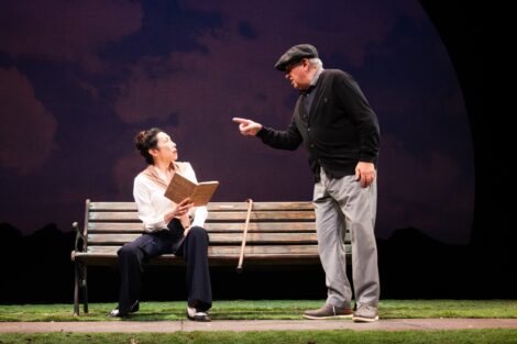 Two people meet on a park bench and wooing begins. The same two people meet again another day and the wooing begins. It happens, it seems, every day: the same two people, the same bench. They are kept apart by a woman in white with a bell that rings everytime they get close. We never see the woman, we only hear about her. Where are these three people, who are they, and what were they to one another at another time? We learn a lot about them in Dan Lauria’s new play, “Just Another Day,” now on stage at Simon’s Rock College of Bard in Great Barrington in the Great Barrington Public Theater’s production.