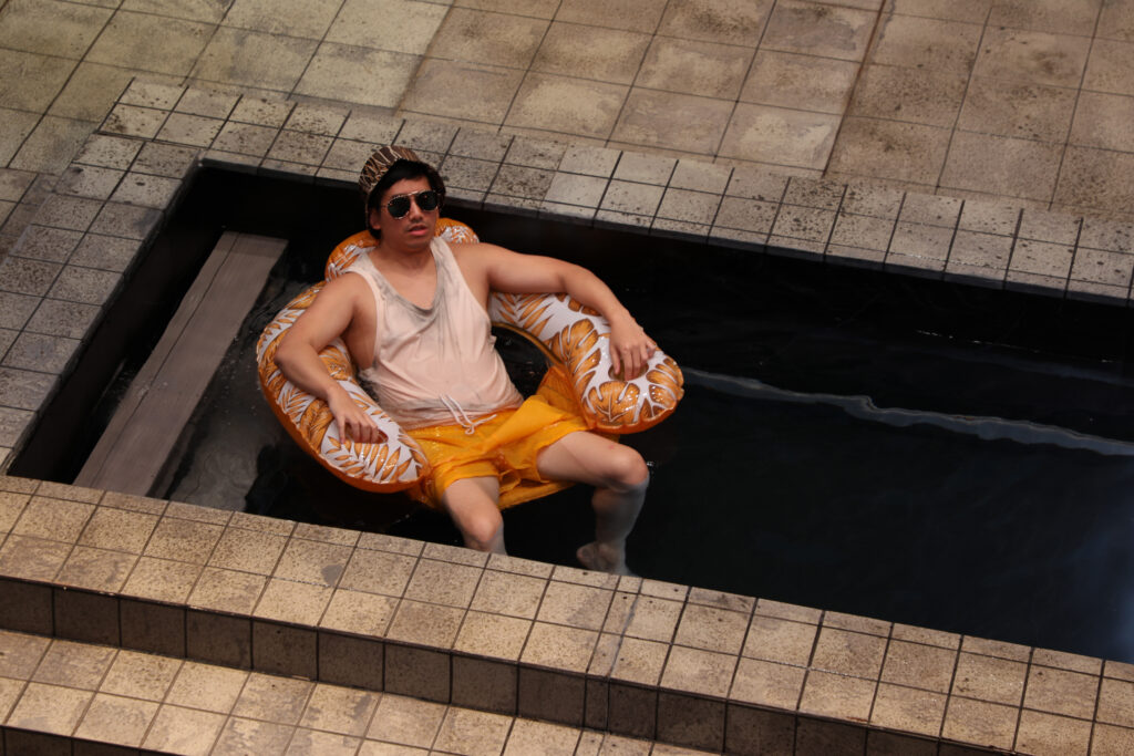 Luckily for the audience, these actors—led by Gregg Edelman and the superb David Adkins—are capable of creating multiple characters who are distinct from the ones before as the show progresses. The tales are mostly familiar. There are no surprises in them. King Midas wishes for the touch of gold and gets it; Orpheus loves Eurydice and loses her in his foolish attempt to see her too soon; Phaeton desires to drive the sun across the sky. The surprises come with the theatrical concept utilizing a three-foot-deep swimming pool as the very centerpiece of the wonderful set designed by Jason Simms. The show opens with the pool being occupied by much of the company while Scott Killian’s beautiful score is being played.