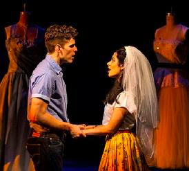 Sometimes love is better the second time around; though, for Tony and Maria, main characters who do not connect with reality very well, there is no second chance. In fact, there is barely a first shot at the grand romance. They have no last names in this show, and their parents exist only in rumor and off-stage calls. Their friends have only rough variations on identity and even the adults are not fully identified, with only the police having last-name identity. Tony and Maria meet at a dance in a high school gym, their instant identification with one another indicated through a shift in the rhythm of the dance music — the frantic mambo becomes a seductive cha-cha-cha, keeping the romance squarely on her side: She is a Puerto Rican immigrant while he is a third-generation Polish-American. It seems only fair that the young woman should rule the day musically and romantically. Their love burns with an intensity for just over a single day, about 26 hours. At least Romeo and Juliet had a few more hours in which to dream and hope for a better future in which their love would repair rivalries.