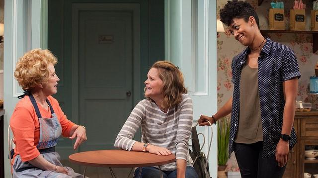 North Carolina. Now. A bakery specializing in designed cakes. A couple seeking a special cake for their wedding. A bigoted baker refusing to honor their request, accept their business. Not the substance of a comedy, you say? Guess again. At Barrington Stage Company, this very relevant hot-button topic forms the substance — the batter, if you will — for a big, beautiful, comedic special event called “The Cake.” It stars, and I mean stars, Debra Jo Rupp as the baker with dreams and delusions, desires and desserts. For her character, Della, the art is in the doing and the doing requires care and precision and the exactness provided by a recipe for success. Della’s world is turned upside down at least five times in this play having its second production in Pittsfield, Massachusetts, the world premiere having been seen last summer in Los Angeles at the Echo Theatre, a performance for which Rupp was nominated for several awards.