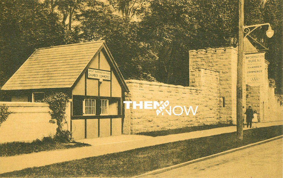 Shown to the right of Duke is the late Dick Snow, former president of Wheeler & Taylor, and then-president of the Chamber of Commerce. The Chamber Visitor Center location has moved around town over the years. It was once located across the street, built into different portions of the Searles Castle wall, as shown in two photos above and below. It was also once located in Stanley Park, across the street from Cumberland Farms. The bottom photograph features the present building.