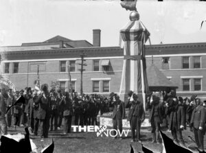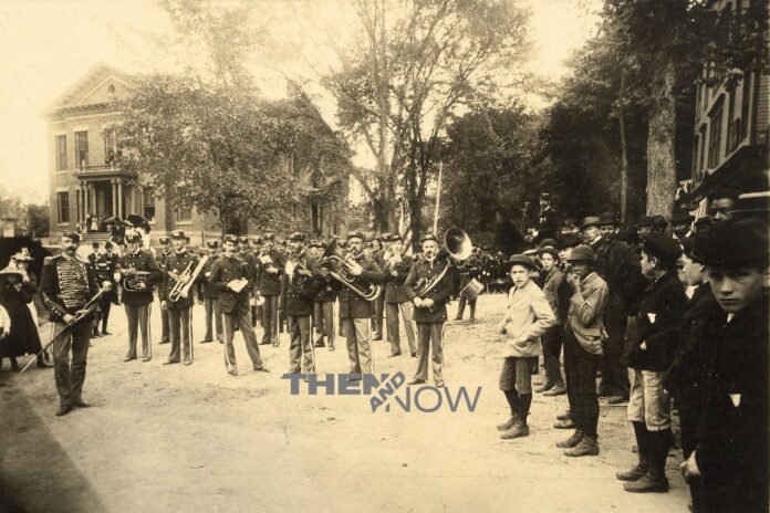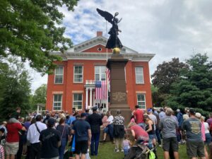 Great Barrington Town Hall has been the centerpiece for many celebrations over the decades. The photograph shown above was taken in 1894. It was likely a Decoration Day (now called Memorial Day) ceremony or a Fourth of July celebration. Photographs that follow below feature Civil War veterans and officials at the Winged Victory statue, Great Barrington’s 150th anniversary celebration in 1911, and this year’s Memorial Day ceremony.