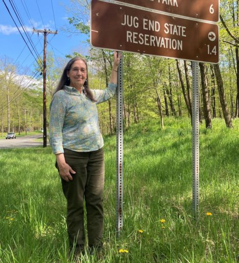 The photograph below features a present-day Jug End sign located near the same spot on Route 23, close to John Andrews Farmhouse Restaurant. Posing with the sign is Nancy-Fay Hecker, the daughter of former Jug End owners Mimi and Angus MacDonald.
