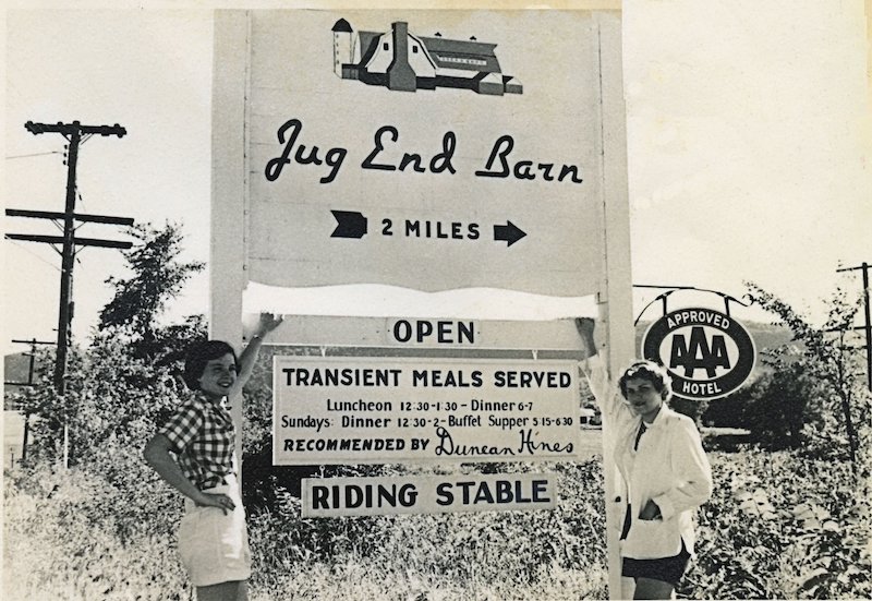 The Jug End Barn sign shown above appeared in a photograph taken in the late 1950s or early 1960s along Route 23 in South Egremont. We have not been able to identify the two women shown in the picture.