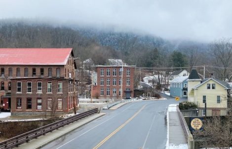 The rare photograph shown above was taken in the 1880s. Looking southeast on Park Street, it features a portion of Monument Mills in the village of Housatonic. The brick structures were part of the complex known as Waubeek Mills, which made bedspreads. The present-day view on Park Street is shown in the below photograph taken atop the railroad track trestle.