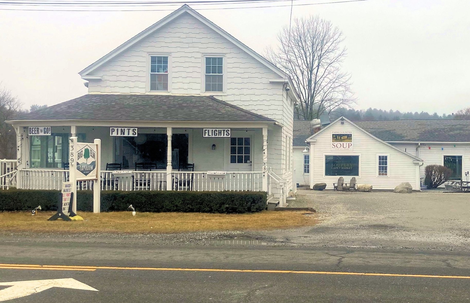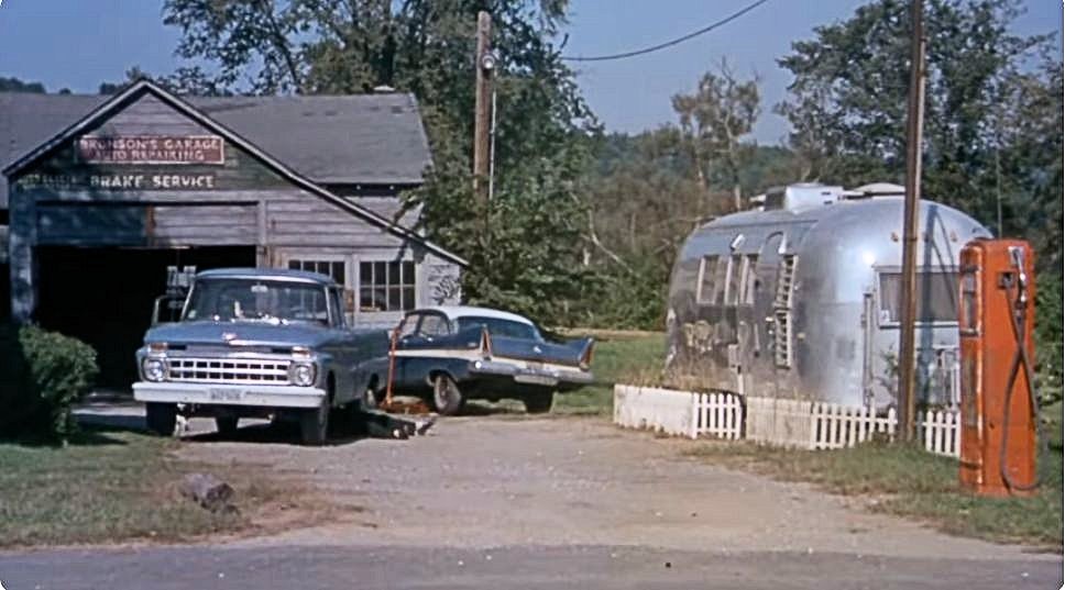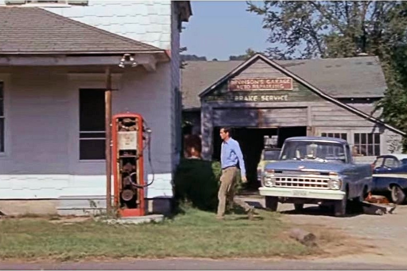 In the photograph shown above, Anthony Perkins is shown on location at the Tracy family residence and garage on Stockbridge Road. An additional vintage view is shown below, followed by a present-day photograph of the same location—now Big Elm Brewing Taproom, Farm Country Soup, and Agaves Mexican Grill.