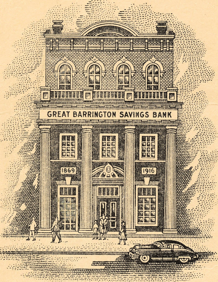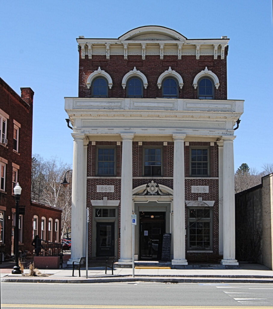 As shown in one of the images below, the large pillars in front were added in 1916 when the building became Great Barrington Savings Bank. It was later home to Housatonic Cooperative Bank, followed by Pittsfield Cooperative Bank. The building was then considered for an antique toy museum, but that venture never went beyond the planning stages. The structure now houses Rubiner’s Cheesemongers and Rubi’s Café. Private residences are located on the upper floors.