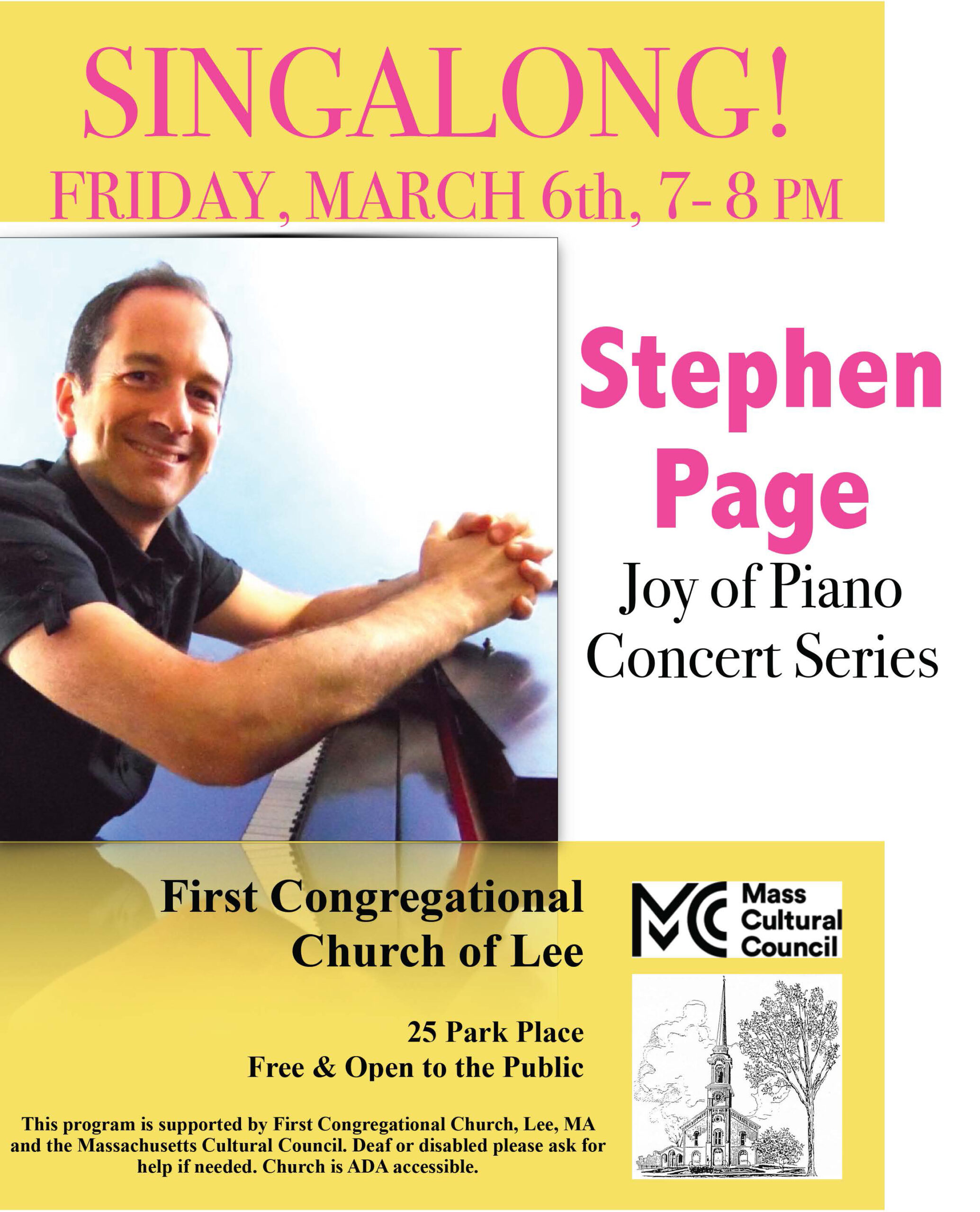 Lee Congregational Church 25 Park Place, Lee, MA, United StatesFirst Congregational Church of Lee will present jazz pianist Stephen Page of Amherst Friday, March 6 from 7-8 pm in a singalong community concert in the historic church. This program, “The Joy of Piano Concert Series,” is supported in part by the church, Maichack Arts, and by the Massachusetts Cultural Council, a state agency, under […]